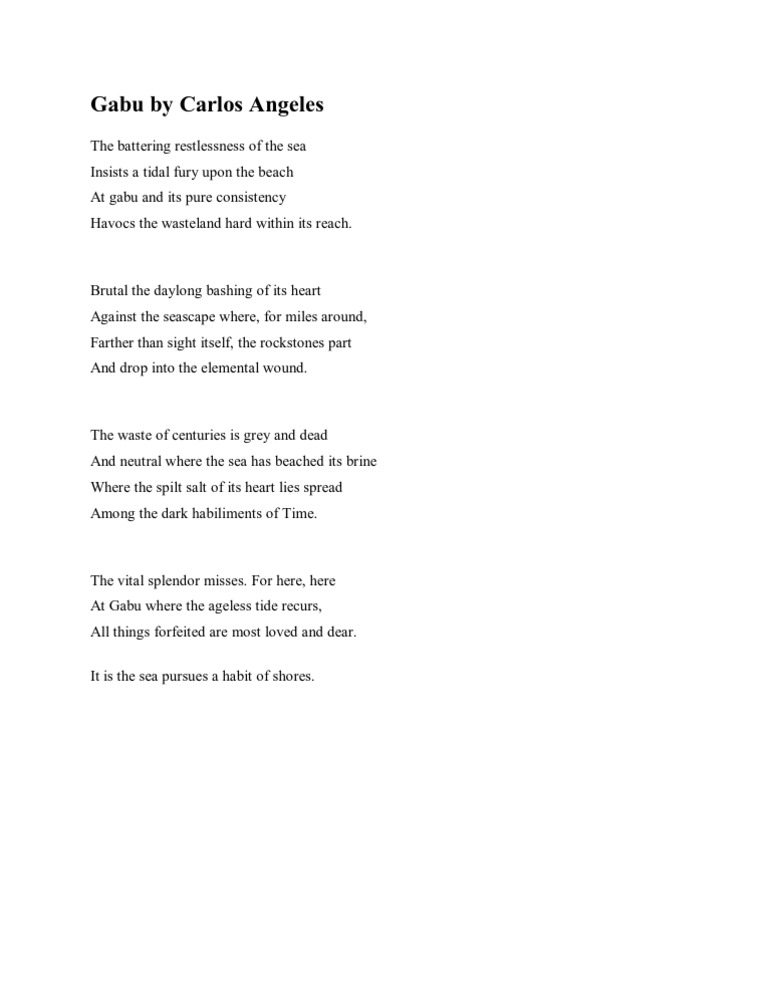 Traveling to assorted universities such as ateneo de manila. It is the sea pursues a habit of shores. Gabu by carlos angeles a new critical reading. Angeles the battering restlessness of the sea insists a tidal fury upon the beach at gabu, and its pure consistency havocs the wasteland hard within its reach. And drop into the elemental wound.